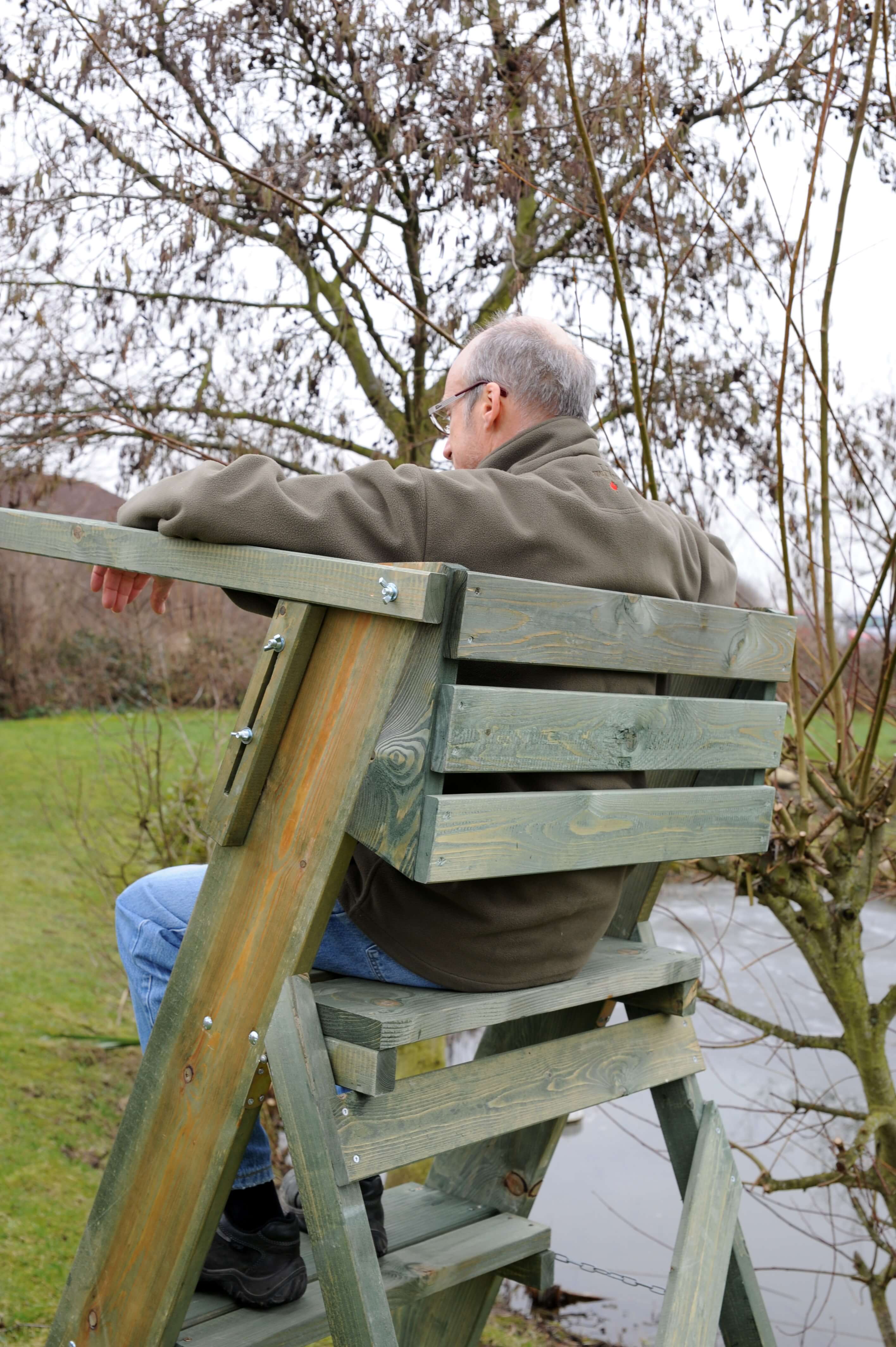 Die klappbare Leiter aus getauchtem Fichtenholz ist für die Ernte- und für die Ansitzjagd (sitzend oder stehend) sehr gut geeignet. Breite Stufen ermöglichen einen leichten Aufstieg und sicheren Stand.