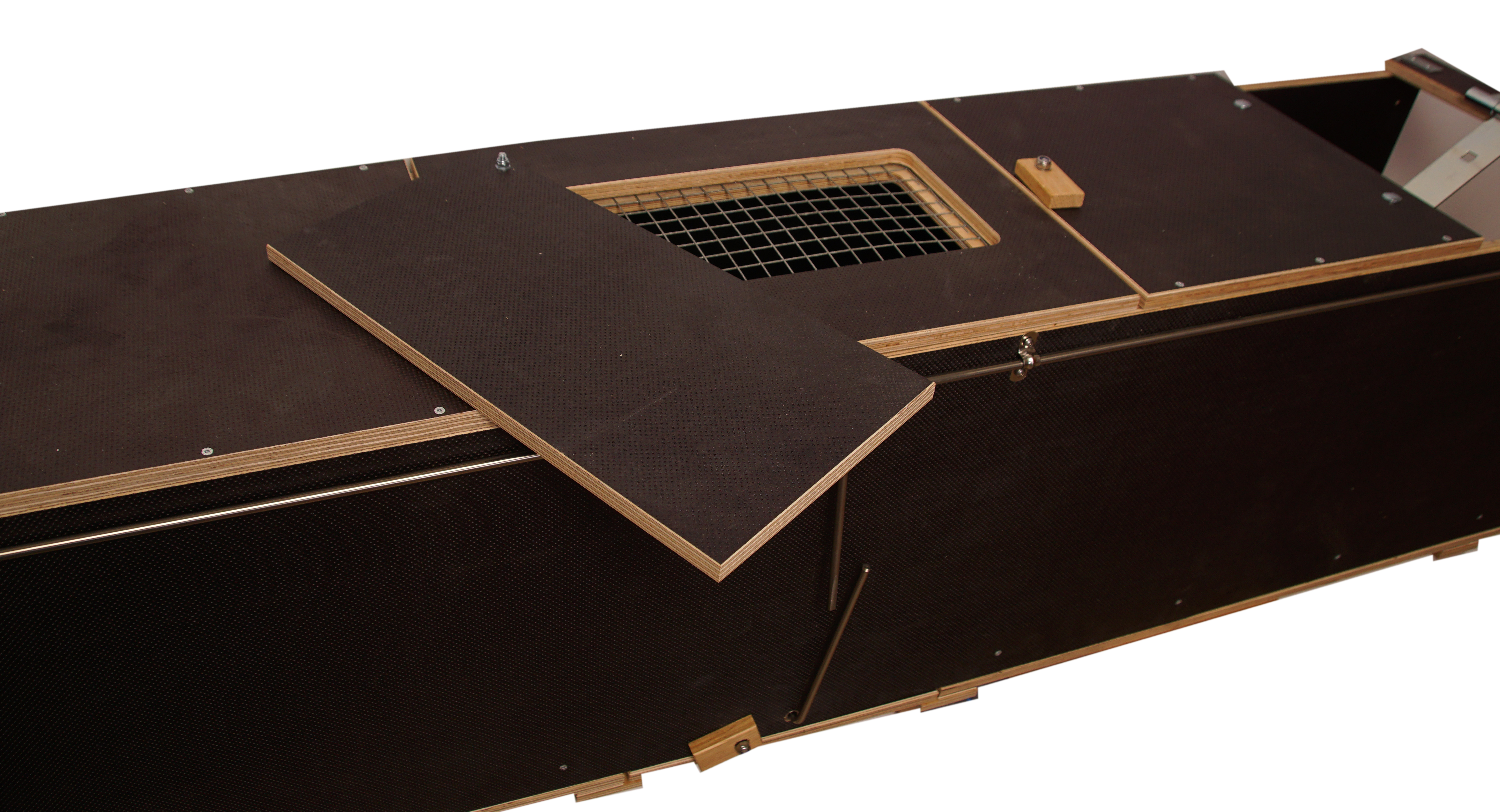 Dieses ermöglicht ein Ansprechen des gefangenes Wildes, sowie die leichte Beköderung und Säuberung der Falle. Die Klappenscharniere und ein Großteil der verwendeten Schrauben bestehen aus rostfreiem Edelstahl.