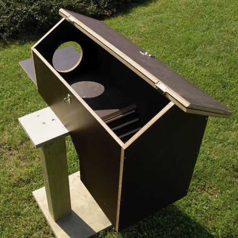 Das Haus besteht aus Siebdruckplatten, eine Dachhälfte lässt sich öffnen.